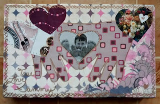 I started out with some scrap pieces of wood, though you could use canvas, poster board, or paper as a background. I covered the board with pretty paper and slightly watered down white glue a-la decoupage. Then it's a matter of layering on the photo, adding hearts or other embellishments, writing with marker, coloring, or whatever makes you happy.