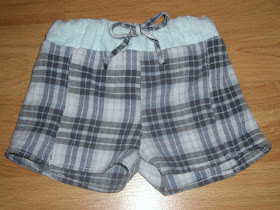 The shorts came out way too small, so I took them back apart and added the waistband to the width of the leg and made a new waistband out of coordinating flannel (an old pillowcase).